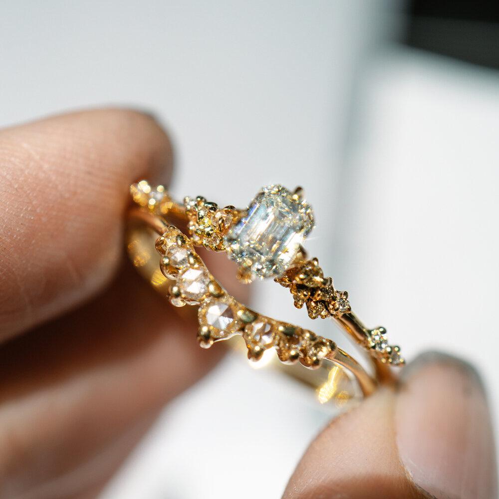 Wrapping around your finger with an ethereal, airy sparkle! Wildly delicate and finely finished, Daphne is both complex and understated, with the tiniest of details. This Daphne Ring has a .5ct emerald cut diamond centre stone, clutched by the most petite hand-shaped claws.